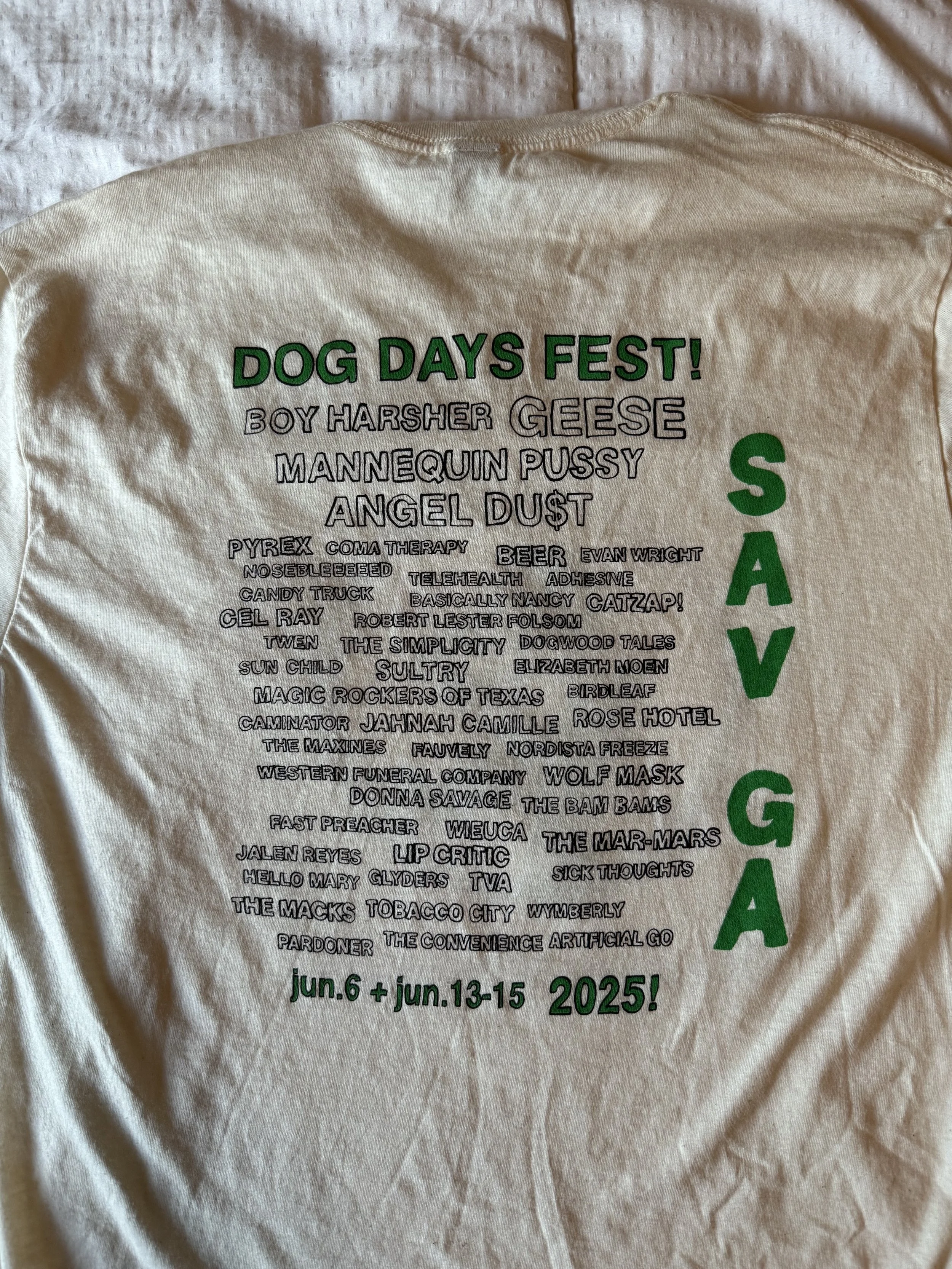 DOG DAYS DOES FASHION DDF "GUN" $30.00 LADIES' BABY RAGLAN (grey/black) $30.00 LADIES' BABY RAGLAN (baby blue) $30.00 DDF 2025 FESTIE "DEAD" TEE $35.00 BLACK + CREAM POCKET TEE $35.00 SIMPLE BLACK TOTE $25.00 DDF CANVAS BEACH TOTE $35.00 SMOKING BUCKIE (ARMY GREEN) $30.00 SMOKING BUCKIE (BLACK) $30.00 DDF DENIM DAD HAT $30.00 DDF PINK DAD HAT $30.00 DDF BLACK DAD HAT $30.00 DDF SUN LOGO (BLACK) XL ONLY $25.00 DDF23 LOGO POCKET (WHITE) one left!!! from $15.00 Sold out DDF LINEUP TEE from $15.00 DDF BASEBALL TEE $25.00 "CENTER OF THE UNIVERSE" TEE $12.00 'STOP TALKING AT SHOWS' HAT $15.00 Sold out DDF CAMO HAT $25.00 DOG DAYS OG CANVAS TOTE $15.00 DDF BLUE TOTE $15.00 DDF '24 RED FONT $20.00